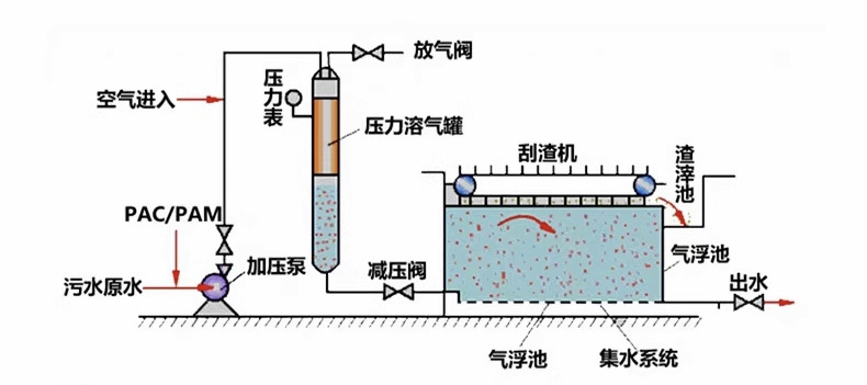 通過溶氣和釋放系統在水中產生大量的微細氣泡,使其粘附于廢水中密度與水接近的固體或液體微粒上,造成整體密度小于水的狀態,并依靠浮力使其上升至水面,從而達到固液或液液分離的目的。